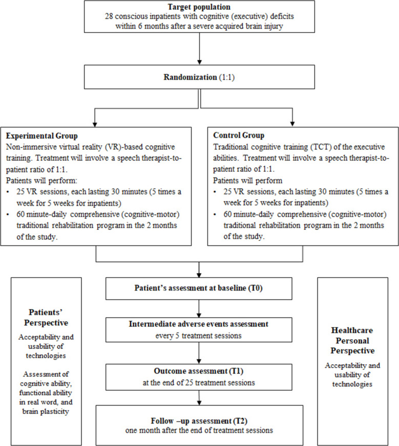 Background: After a severe acquired brain injury (sABI), individuals might experience mild-to-severe cognitive impairments. In these patients, cognitive rehabilitation is provided as early as possible, to take advantage of and guide brain plasticity. According to a restorative approach, traditional cognitive training (TCT) usually involves repeated paper-and-pencil exercises of increasing difficulty and targeting specific cognitive domains. Recently, some evidence supported the use of virtual reality (VR) for ABI rehabilitation, particularly focusing on stroke cases. Nonetheless, there is limited evidence in sABI and in different etiologies. The present multicenter randomized controlled trial aims at exploring the effectiveness, in terms of clinical-functional, neurophysiological, and biomarker changes, of a cognitive rehabilitation focused on executive functions performed by a non-immersive VR device, compared to TCT, in a cohort of patients with sABI.