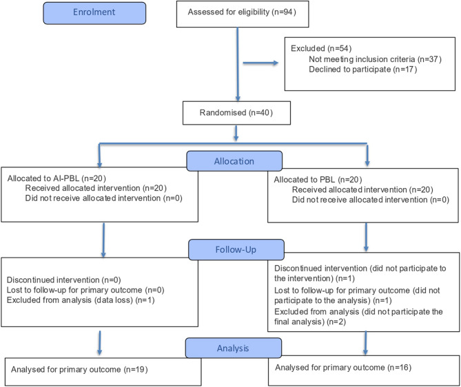 Results: Forty students were randomized equally into two groups: AI-PBL (n = 20) and traditional PBL (n = 20). Both groups showed significant improvements in knowledge and reading motivation. The AI-PBL group showed significantly greater improvement in knowledge retention at 2 weeks (Cohen's d = 3.14) and greater gains in AI self-efficacy. Although Mini-CEX scores were higher in the AI-PBL group, the differences between groups were not statistically significant. No significant increase in internet addiction was observed in the AI-PBL group.
