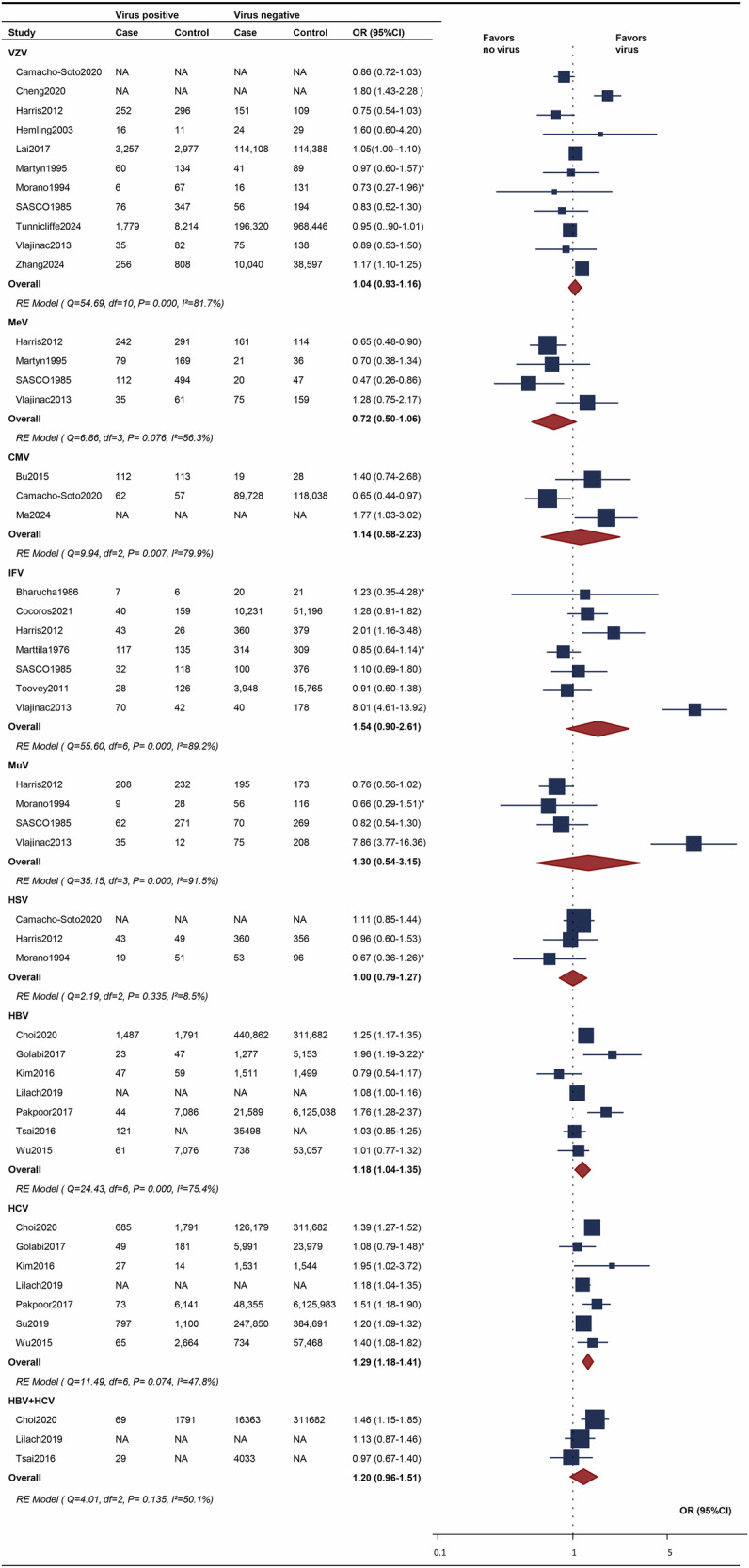 Methods: Thorough searches were conducted across Embase, PubMed, Cochrane Library, Web of Science and Scopus until May 18, 2025, to identify observational studies investigating the relationship between viral infections and the risk of NDs, including AD, PD, and ALS. Meta-analyses were executed using a random-effects model with Stata MP18.0.