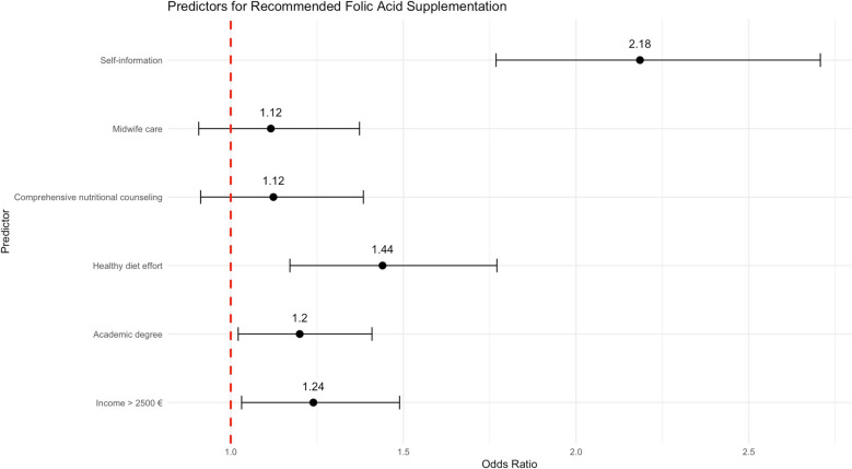 Methods: Pregnant women (≥ 6th week of gestation) were recruited nationwide via social media (January–June 2022), and completed an online questionnaire assessing sources and content of their nutritional information. The data were subsequently analyzed for their alignment with guidelines provided by the Germany-wide Healthy Start Network of the Federal Center for Nutrition and the German Nutrition Society. Chi-square and t-tests were used to explore associations, and multivariable logistic regression was conducted to identify significant predictors of supplement use and dietary practices, considering sociodemographic and behavioral factors.