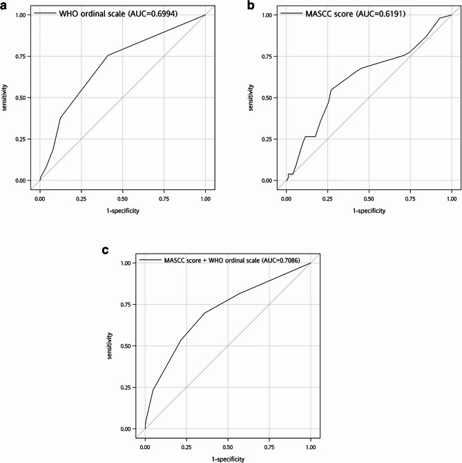 Results: A total of 304 adult COVID-19 in-hospital patients with neutropenia were included into the study. Higher rates of intubation, oxygen use, and ICU admission were observed in the non-survival group. The MASCC score, the WHO ordinal scale and the combined scoring system showed predictive ability for in-hospital mortality, and the combined scoring system had the best predictive power.