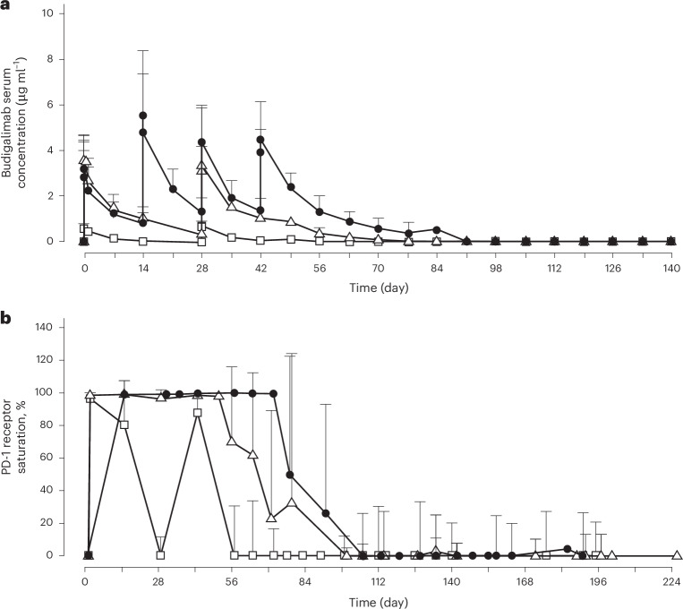 Chronic human immunodeficiency virus type 1 (HIV-1) disease results in immune exhaustion and dampened T cell responses, and programmed cell death 1 (PD-1) inhibitors offer a potential approach to enable viral control without antiretroviral therapy (ART) through reversal of these effects. Budigalimab is an investigational humanized anti-PD-1 monoclonal antibody. Multiple intravenous (IV) low doses of budigalimab (Stage 1: 2 mg n = 10, 10 mg n = 10, placebo n = 5, two doses every 4 weeks; Stage 2: 10 mg n = 11, placebo n = 5, four doses every 2 weeks (Q2W)) were assessed in people living with HIV (PLWH; n = 41) in a randomized, double-blind, multicenter, placebo-controlled phase 1 study with an analytical treatment interruption (ATI) to identify an efficacious regimen with a favorable safety profile in PLWH. The primary endpoints were safety, tolerability and pharmacokinetics. Demographics and baseline characteristics were balanced across treatment groups, except for sex, which was mostly male. All participants identified as cisgender. Budigalimab was well tolerated for up to 44 weeks, with 29 of 41 participants experiencing an adverse event (AE), including 2 participants who each experienced one grade 1 reversible immune-related AE (thyroiditis, hyperthyroidism). Three grade 3 AEs were reported by two participants and one serious AE by one participant; none were deemed related to treatment. IV budigalimab 10 mg Q2W resulted in a slight accumulation of drug in serum, with concentrations remaining above the estimated concentration required for near-complete (>95%) PD-1 receptor saturation on CD8+ T cells for ~10 weeks in peripheral blood. In an exploratory efficacy analysis of a 12-week ATI initiated with the first of four 10 mg Q2W doses, 6 of 11 participants experienced a delayed rebound with a relatively low viral peak and/or off-ART viral control (<200 copies ml-1) for ≥6 weeks during ATI, with 2 sustaining ART-free viral control to study end (204-252 days). The study achieved prespecified endpoints, supporting further evaluation of budigalimab in PLWH in a phase 2 study. ClinicalTrials.gov identifier: NCT04223804 .