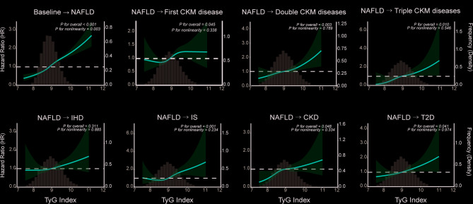 Results: Among 377,757 participants (median age 57 years), 4949 developed NAFLD over a median follow-up of 13.6 years. Of these, 12.65% progressed to T2D, 9.11% to IHD, 8.63% to CKD, and 4.61% to IS. Elevated TyG levels significantly accelerated transitions from NAFLD to first-onset CKM disease (HR = 1.25, 95% CI 1.05-1.49), double CKM disease (HR = 1.46, 95% CI 1.19-1.80), and triple CKM disease (HR = 1.81, 95% CI 1.28-2.55). Similar progression risk increases were observed for individual CKM components: T2D (HR = 1.41, 95% CI 1.11-1.78), CKD (HR = 1.37, 95% CI 1.08-1.75), and IS (HR = 1.70, 95% CI 1.27-2.27). A J-shaped dose-response relationship was identified. Transitions risk remained pronounced among individuals with healthy sleep and regular physical activity.