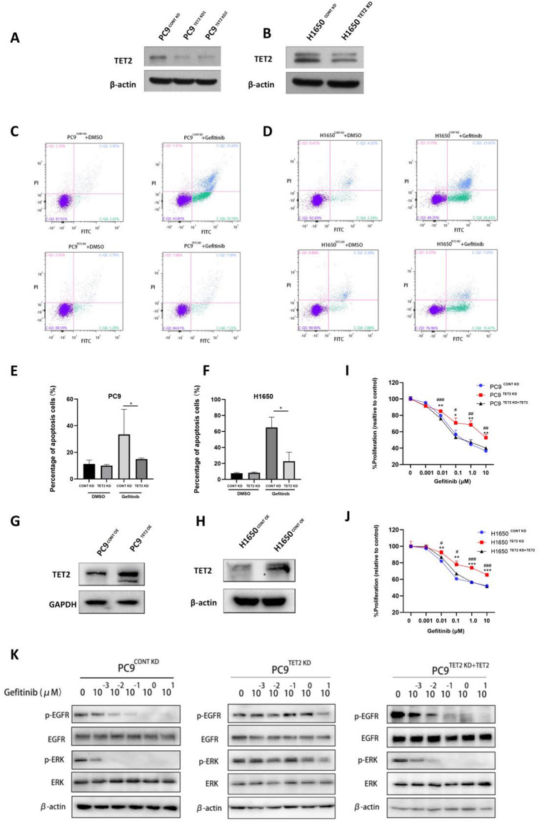 Through targeted next-generation sequencing of 83 non-small cell lung cancer (NSCLC) patients with first-generation epidermal growth factor receptor tyrosine kinase inhibitor (EGFR TKI) resistance, we detected 11% TET2 mutations in the T790M-negative subgroup. To explore the molecular mechanism of TET2 in EGFR TKI resistance, reduced representation bisulfite sequencing (RRBS) was adopted to analyze the global genomic methylation profiles and detect the differentially methylated genes in the TET2-knockdown (KD) PC9 and control PC9 cell lines, following bioinformatics analysis of gene ontology (GO) functions and kyoto encyclopedia of genes and genomes (KEGG) signaling to screen for genes associated with drug resistance. TET2 KD attenuated gefitinib-induced apoptosis and decreased the sensitivity of EGFR-mutant lung cancer cells to gefitinib. Forty-three drug resistance genes with hypermethylated promoter regions were identified via RRBS and bioinformatic analysis in PC9TET2 KD cells. Then, 10 candidate genes were screened for further validation. RT‒PCR demonstrated that the expression of AXIN2 and CSK was significantly lower in PC9TET2 KD cells than in control cells. Furthermore, AXIN2 KD attenuated gefitinib-induced apoptosis and decreased the sensitivity of PC9 cells to gefitinib. Importantly, we found that the demethylation drug decitabine (DCA) could reverse gefitinib resistance in PC9TET2 KD cells and mouse models. These results indicate that the methylation of AXIN2 induced by TET2 repression is a novel resistance mechanism of EGFR TKIs in EGFR-mutant NSCLC. Demethylation drugs have the potential to overcome EGFR TKI resistance induced by loss-of-function TET2 mutations.