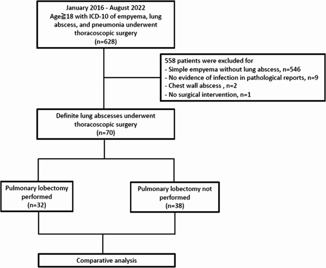 Methods: We retrospectively analyzed 70 patients who underwent salvage thoracoscopic surgery for lung abscess, along with 60 days' follow-up, at a tertiary referral hospital between January 2016 and August 2022. Thirty-two patients underwent lobectomy, while 38 did not. The patients' demographics, comorbidities, disease progression, 30-day and 60-day mortality, and operative morbidity were compared between the lobectomy and non-lobectomy groups.