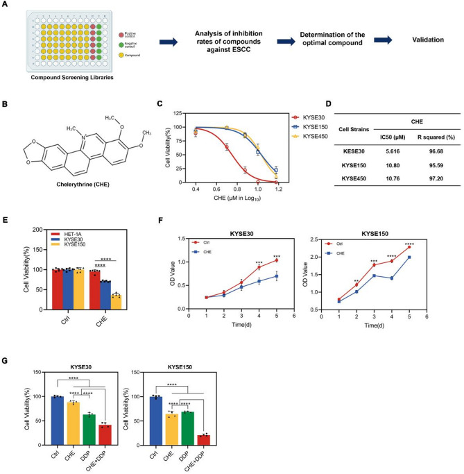 Background: Chelerythrine (CHE) exhibits notable anti-inflammatory and antitumor properties, while its impact on esophageal squamous cell carcinoma (ESCC), especially the underlying mechanisms remain unclear. In this study, we aim to investigate the roles and mechanism of CHE in the ESCC treatment.