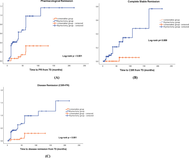 Methods: This was an observational retrospective case-control study of LOMG patients followed at the MG Clinic of Pisa University Hospital from 1996 to 2024. Inclusion criteria were: diagnosis of non-thymomatous gMG with anti-AChR antibodies; age at onset ≥ 50 years, and minimum follow-up of 12 months. The cumulative incidence of disease remission between the thymectomy and the conservative group was compared with Kaplan-Meier analysis with log-rank test and the Cox regression model was used to estimate the effect of thymectomy on achieving remission after adjustment for confounding variables.