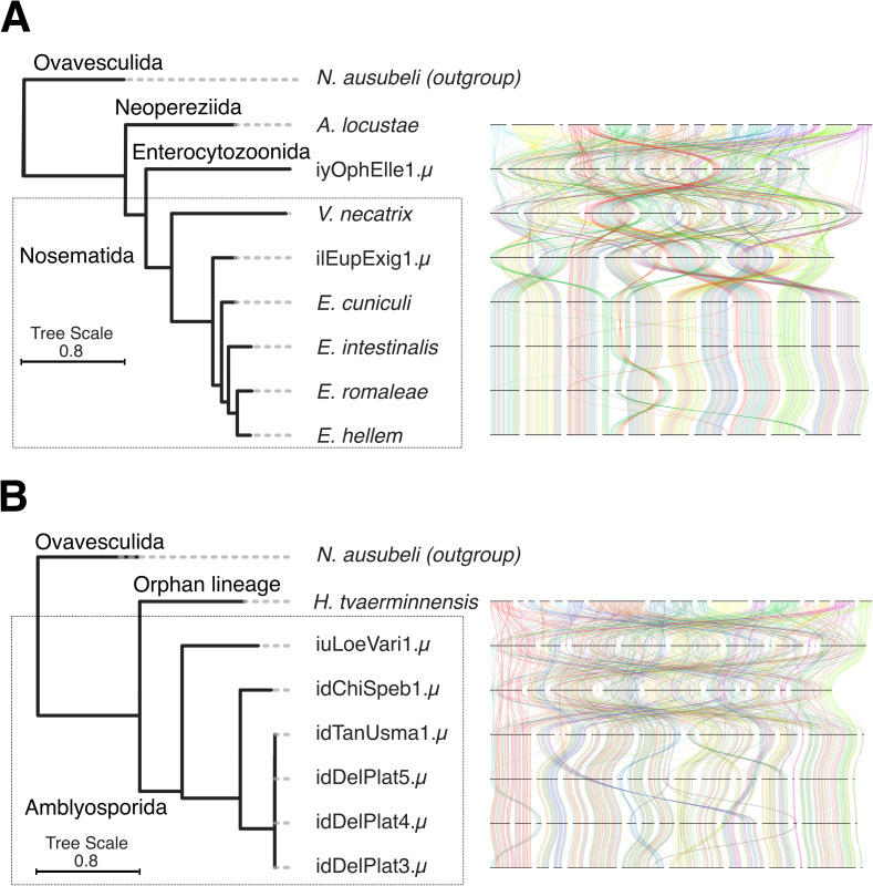 Microsporidia are single-celled, obligately intracellular parasites with growing public health, agricultural, and economic importance. Despite this, Microsporidia remain relatively enigmatic, with many aspects of their biology and evolution unexplored. Key questions include whether Microsporidia undergo sexual reproduction, and the nature of the relationship between tetraploid and diploid lineages. While few high-quality microsporidian genomes currently exist to help answer such questions, large-scale biodiversity genomics initiatives, such as the Darwin Tree of Life project, can generate high-quality genome assemblies for microsporidian parasites when sequencing infected host species. Here, we present 40 new microsporidian genome assemblies from infected arthropod hosts that were sequenced to create reference genomes. Out of the 40, 32 are complete genomes, eight of which are chromosome-level, and eight are partial microsporidian genomes. We characterized 14 of these as polyploid and five as diploid. We found that tetraploid genome haplotypes are consistent with autopolyploidy, in that they coalesce more recently than species, and that they likely recombine. Within some genomes, we found large-scale rearrangements between the homeologous genomes. We also observed a high rate of rearrangement between genomes from different microsporidian groups, and a striking tolerance for segmental duplications. Analysis of chromatin conformation capture (Hi-C) data indicated that tetraploid genomes are likely organized into two diploid units, similar to dikaryotic cells in fungi, with evidence of recombination within and between units. Together, our results provide evidence for the existence of a sexual cycle in Microsporidia, and suggest a model for the microsporidian lifecycle that mirrors fungal reproduction.