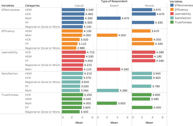 Results: A total of 81 participants completed the questionnaires. Overall, we observed a high level of satisfaction among health extension workers, midwives, and focal persons regarding the eCHIS application. However, we also identified some discrepancies in terms of learnability, efficiency, effectiveness, trustfulness, and satisfaction. We found that most health workers who casually utilize eCHIS applications had service experience greater than 10 years, eCHIS experience less than 2 years, and were in good connectivity areas, and were satisfied with the usability of eCHIS applications. Furthermore, the eCHIS usability was examined using the five metrics across the different eCHIS users (health extension workers, health professionals, focal persons, and staff at the Ministry of Health, regional, zonal, and woreda levels), which revealed relatively comparable mean score values for novice, casual, and expert users.