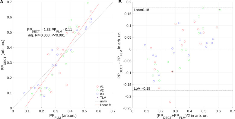 Results: Regression analysis revealed a good overall association (R2 = 0.81) between PPFLM and PPDECT, with PPDECT substantially overestimating PPFLM up to 30%, with limits of agreement of -18 and 18%, Low PPFLM was underestimated, while high PPFLM was overestimated by PPDECT, indicating a higher sensitivity of the later. Changes of PPDECT and PPFLM had a concordance of 69.4% for all measurements. Agreement and concordance were highest in ventilated and lowest in non-ventilated ROIs. No persistent iodine enhancement was detected in the lung parenchyma after repetitive measurements per hour.