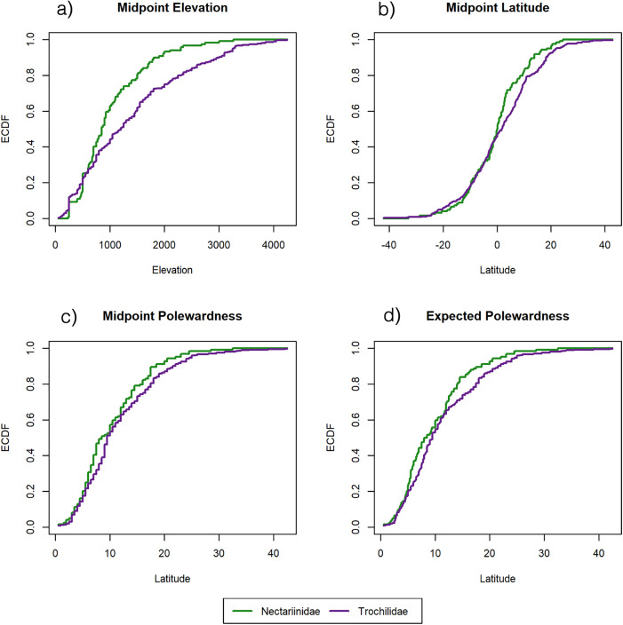 Convergence between species and entire clades can occur due to shared environmental conditions and shared resource use. Comparisons of biogeography between convergent clades and taxa may reveal some of these properties unique to each taxon. We sought to characterize and compare the global scale biogeography of hummingbirds (family Trochilidae), which possess unique adaptations for nectar feeding, with sunbirds (family Nectariniidae), which also feed on nectar but are more generalist in their feeding ecology. We collected the latitudinal and elevational range of all species in both clades to create species distributions along those gradients by way of empirical cumulative distribution functions. We compared those distributions to see 1) if they differed, by way of minimum difference estimation and 2) how they differed, by way of non-linear regression. Hummingbirds are shown to extend into higher elevations and latitudes compared to sunbirds, and better maintain their species number in these more extreme environments. We provide possible reasons for these patterns including dispersal limitation, land area, diversity of resources, and climatic conditions. In one particularly interesting hypothesis, we propose that hummingbirds' unique adaptations for nectar feeding allow them to exploit resources more efficiently, gain higher intrinsic fitness, and therefore speciate and spread into more extreme climates than less efficient nectar feeding sunbirds.