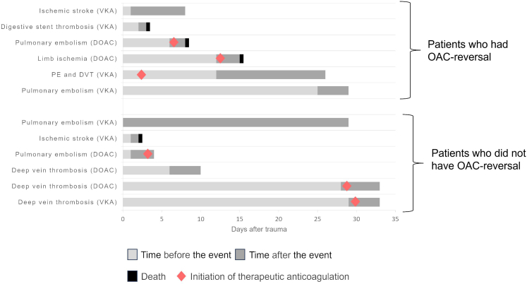 Interpretation: Preinjury OAC therapy substantially increased trauma mortality, particularly with VKA. Guideline-concordant reversal was associated with reduced mortality in both VKA- and DOAC-treated patients without excess thrombotic risk but remains underused. These findings emphasise the urgent need for systematic implementation of reversal strategies in OAC-treated trauma patients.