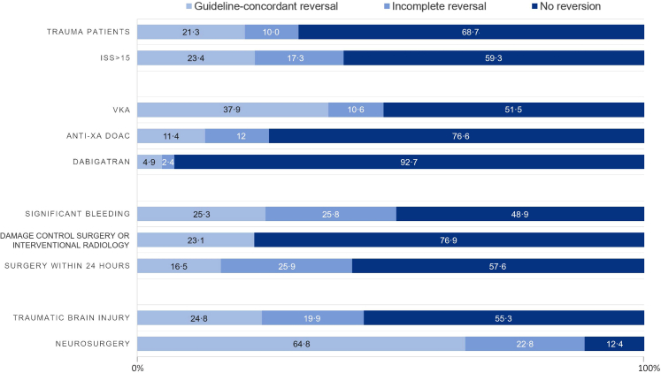 Findings: Of the 27,426 trauma patients, 3% were OAC-treated. They were older, had more comorbidities, and experienced higher mortality. After matching (n = 2196), OAC therapy remained independently associated with increased mortality (day 1: OR 2·21, 95% CI [1·41-3·43]; day 7: OR 2·06, [1·41-3·00]), with greater risk from vitamin K antagonists (VKA) than direct oral anticoagulants (DOAC). Guideline-concordant OAC reversal, achieved only in 21% of cases, independently reduced mortality at day 1 (OR 0·10, 95% CI [0·03-0·31], p < 0·01) and day 7 (OR 0·51, 95% CI [0·22-0·97], p < 0·01). No significant association was found between reversal and thrombotic complications.