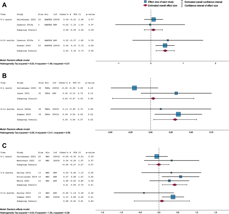 Findings: From 14,985 studies screened, 30 articles were included (n = 5102 participants; 833 PIFS/PIFS-like cases, n = 4269 recovered control participants) with many studies excluded by inadequate quality in eligibility criteria. The meta-analysis (11 studies; n = 413 PIFS cases, analysed with random-effects models) showed PIFS cases had increased: white cell counts at 3-6 months (Cohen's d: 0.41, 95% CI 0.09-0.74); and circulating levels of RANTES and TNFα at 6-12 months (Cohen's d: 0.45 [95% CI 0.16-0.73] and 0.30 [95% CI 0.04-0.57], respectively) compared to controls recovered from the same exposure.