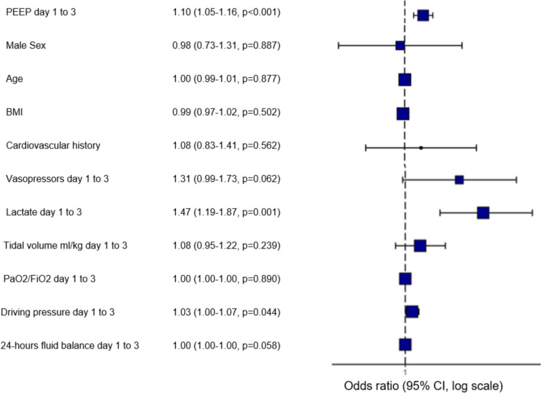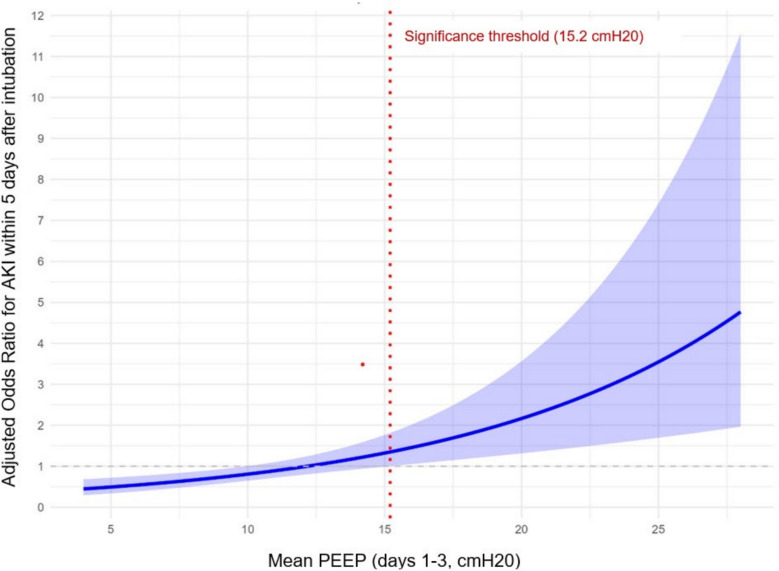 Results: A total of 1,066 patients were included in the analysis. Among them, 510 (48%) developed AKI within the first 5 days after intubation. After multivariable adjustment, higher daily mean PEEP levels, averaged over the first 3 days of mechanical ventilation and treated as a continuous variable, were independently associated with the development of AKI (odds ratio [OR] 1.10; 95% confidence interval [CI] 1.05-1.16). A PEEP level exceeding 15.2 cmH2O was significantly associated with the occurrence of AKI.