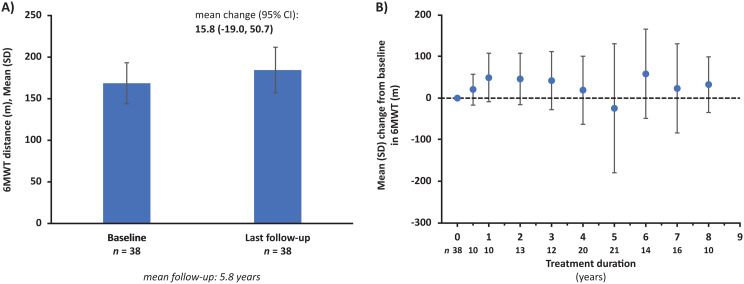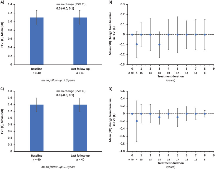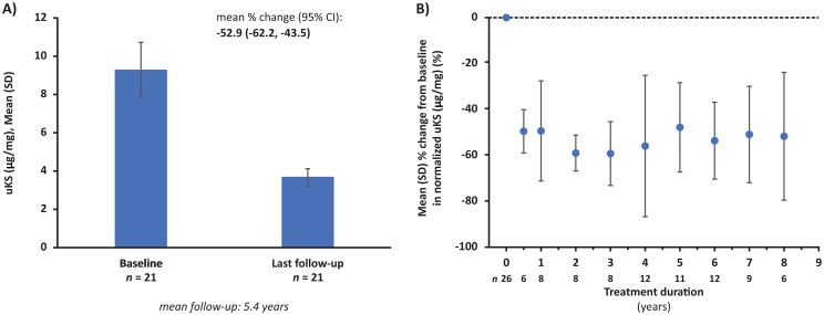 Results: As of February 13, 2022, 90 patients who initiated ERT had enrolled (median exposure: 5.6 years; median age at first ERT: 27.8 years). Reductions from baseline in uKS levels were sustained over mean follow-up of 5.4 years (mean percent change: -52.9%; p < 0.0001). In patients with available data, mean change in 6MWT distance was + 15.8 m (p = 0.3627) over a mean follow-up of 5.8 years. FEV1 and FVC remained stable over mean follow-up of 5.3 years (mean change: 0.0 L for both). The mean change from baseline in EQ-5D-5L index score was + 0.1 after 1 year of treatment. Thirty-four patients (39.5%) had ≥ 1 adverse event (AE), 23 patients (26.7%) had ≥ 1 serious AE, and 10 (11.6%) had ≥ 1 drug-related AE (infusion-related reactions [n = 3; 3.5%], pyrexia [n = 2; 2.3%]). Eight deaths occurred; none were deemed treatment related.