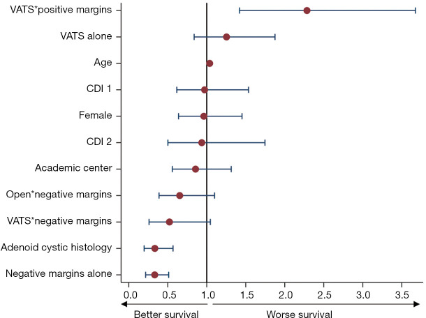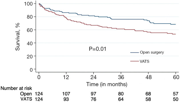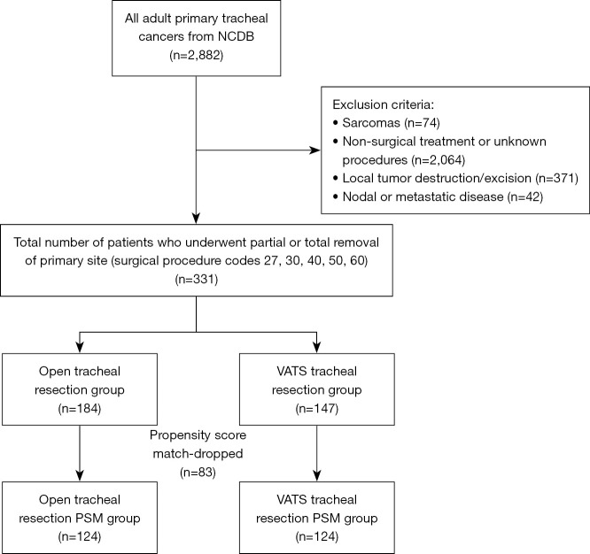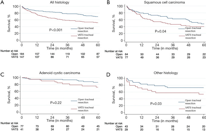 Results: Of 331 patients undergoing tracheal cancer resection, 147 (44.4%) were started VATS with 5 (3.4%) converting to open. Patients undergoing VATS tracheal resection were similar in age (62.4±14.5 vs. 59.9±14.2 years; P=0.12), race (White =81.0% vs. 84.8%; P=0.32) and Charlson-Deyo comorbidity (index =0, 59.2% vs. 68.5%; P=0.19), but were more likely to be male (57.8% vs. 46.2%; P=0.04) and have positive margins (58.1% vs. 41.0%; P=0.006) compared to open resection. Post-operative length of stay was shorter with VATS (median 2.5 vs. 7.0 days; P<0.001), but this came at the expense of higher rates of positive margins [adjusted odds ratio (aOR) =2.15, P=0.02] and worse median survival (74 vs. 106 months; P<0.001), which persisted after matching (79 vs. 100 months; P=0.01).