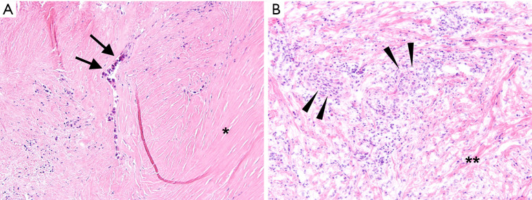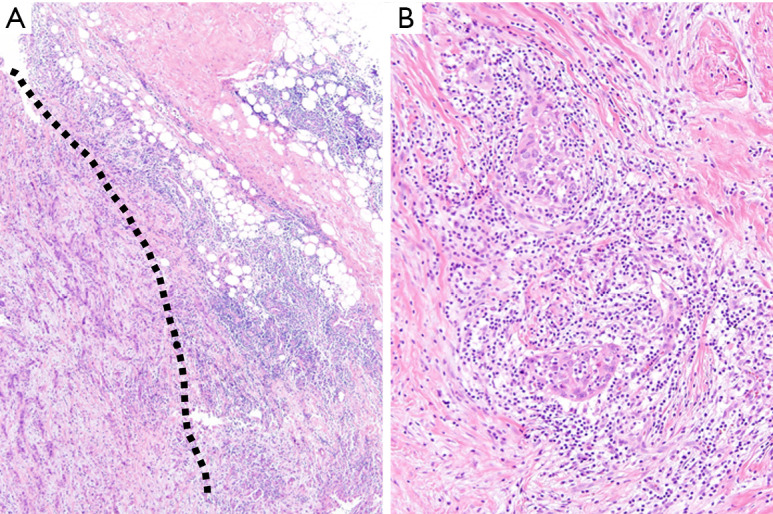 Results: Among 112 NSCLC cases, the presence of pleural nodularity during the operative procedure was identified as an independent predictor for pleural metastasis [odds ratio (OR) 8.33, 95% confidence interval (CI): 3.36-20.65, P<0.001]. Microscopic examination revealed that sclerotic fibrosis was associated with pleural metastasis in ADC (OR 6.56, 95% CI: 1.71-25.26, P=0.006), whereas metastatic SqCC exhibited a higher inflammatory component than ADC (80.0% vs. 30.1%, P<0.001), albeit without significant prediction for pleural metastasis in SqCC.