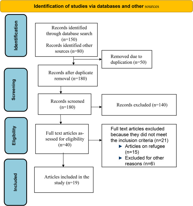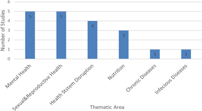 Results: Of 230 identified, 19 studies met the inclusion criteria. The studies addressed six thematic areas. Maternal and reproductive health (n = 5), mental health (n = 5), health system disruption (n = 4), nutrition (n = 4), chronic diseases (n = 2), and malaria outbreak (n = 1). Health system disruption (51%), gender-based violence (40%), post-traumatic stress disorder (40%), depression (66.5%), anxiety (63%), chronic diseases treatment disruption (80%), and malaria outbreak; 26.5/1000 attack rate and 43% slide positive rate were key findings.