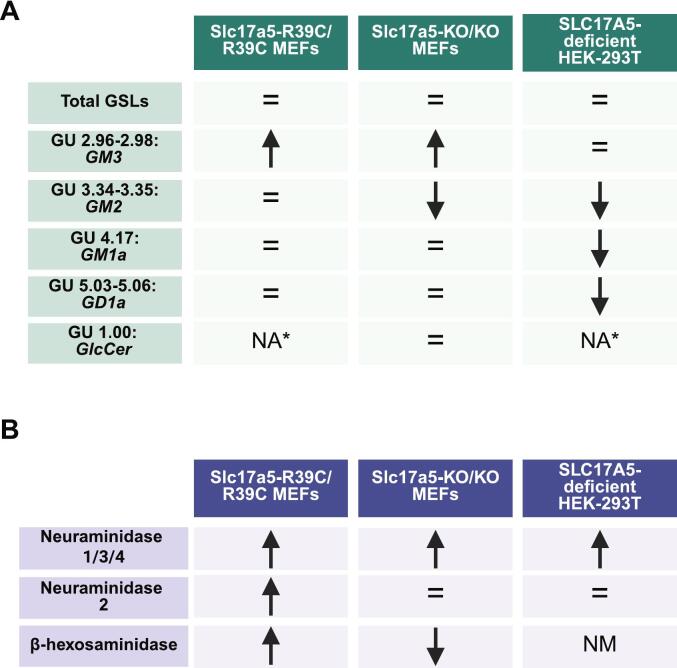 Free sialic acid storage disorder (FSASD) is an autosomal recessive lysosomal storage disease caused by biallelic pathogenic variants in SLC17A5, which encodes the lysosomal sialic acid transporter, sialin. FSASD is characterized by excessive lysosomal free sialic acid accumulation, leading to either a severe, early-onset lethal phenotype or a progressive neurodegenerative course. To characterize biochemical alterations in FSASD models, we performed comprehensive profiling of glycosphingolipids (GSLs), including sialylated species (i.e., gangliosides), in mouse embryonic fibroblasts (MEFs) derived from Slc17a5-R39C/R39C and Slc17a5-KO/KO mouse models, as well as in human SLC17A5-deficient HEK-293 T cells generated via CRISPR-Cas9-mediated non-homologous end joining. HPLC-based analyses demonstrated GM3 ganglioside accumulation in MEFs and significant reductions in a-series GSLs-including GM2, GM1a, and GD1a-in SLC17A5-deficient HEK-293 T cells. Analysis of neuraminidase 1/3/4 activities revealed consistently elevated activity across all cell models, while cytosolic neuraminidase 2 showed only a modest increase in Slc17a5-R39C/R39C MEFs. Preliminary quantification showed elevated free sialic acid across all models, consistent with the characteristic biochemical defect observed in FSASD and supporting their relevance for mechanistic studies. These findings highlight that free sialic acid storage leads to changes in GSL homeostasis in FSASD mouse (MEFs) and human (SLC17A5-deficient HEK-293T) cellular models, underscoring their utility as models for studying FSASD pathogenesis.