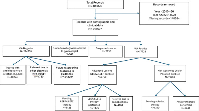 Results: A total of 6,768 women were diagnosed with advanced lesions eligible for loop electrosurgical excision procedure (LEEP) treatment. Among those, 1,476 (21.8%) received LEEP treatment, and 4,164 (61.5%) were referred due to complications. Between 2017 and 2022, 53.3% more women received treatment than between 2010 and 2016. Compared with HIV-negative women, newly diagnosed women with HIV were 2.09 times more likely to have complicated advanced lesions (p < 0.0001). Compared to rural facilities, urban facilities had 0.1 -fold lower odds of referral (p < 0.0001). Compared with third-Level hospitals, health posts had the highest odds of referrals (3.3, p < 0.0001), followed by health centers (1.7, p <0.0001).