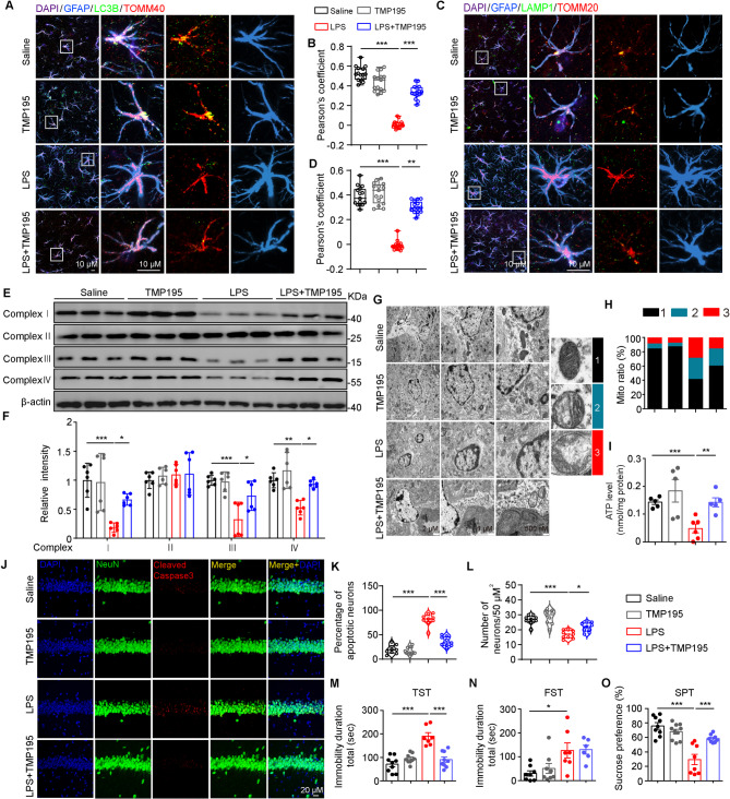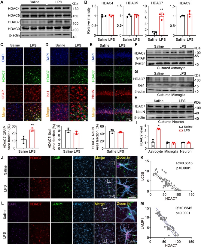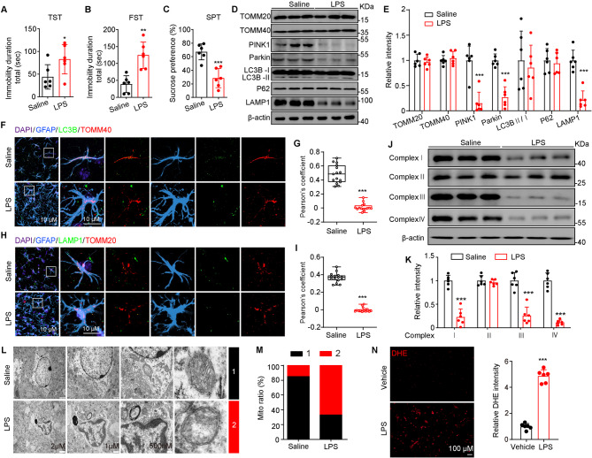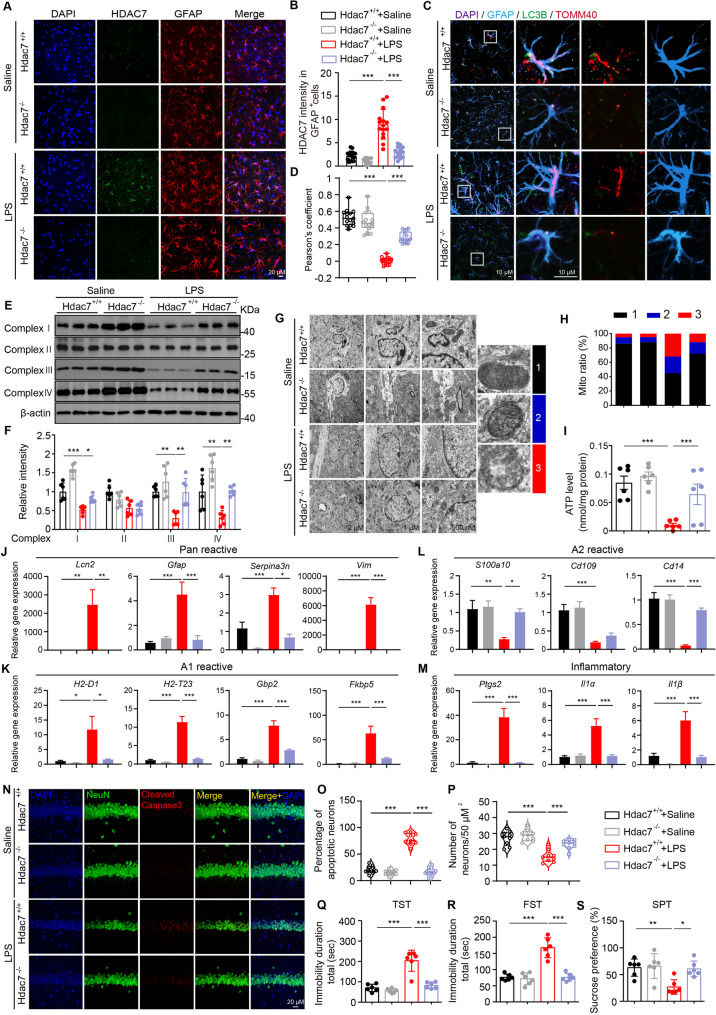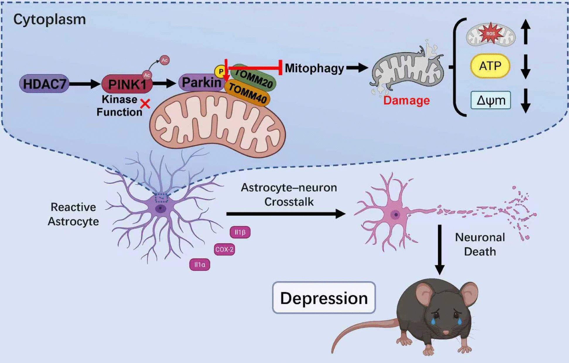 Major depressive disorder (MDD) is a prevalent mental disorder and the leading cause of disability worldwide. Emerging evidence indicates that dysregulation of astrocyte mitochondria metabolism contributes to the pathophysiology of depression. However, the molecular mechanisms underlying the stress-induced astrocytic dysfunction remain poorly understood. Here, we show that impaired mitophagy, which occurring downstream of increased Class IIa histone deacetylases 7 (HDAC7) expression, play a critical role in astrocytic mitochondria dysfunction in a Lipopolysaccharide (LPS)-induced depression-like mouse model. Astrocyte-specific overexpression of HDAC7 in the hippocampus disrupted PTEN-induced putative kinase 1 (PINK1)-Parkinson protein 2 (Parkin)-dependent mitophagy, leading to reduced mitochondrial ATP release, neuronal damage and depressive-like behaviors. Mechanistically, HDAC7 impairs mitophagy by deacetylating PINK1, thereby suppressing phosphorylation of Parkin at Ser65 and inhibiting recruitment of downstream proteins translocase of outer mitochondrial membrane (TOMM) 20 and 40. Notably, Astrocyte-specific knockout or pharmacological inhibition of HDAC7 attenuates LPS-induced astrocytic mitophagy disruption, oxidative stress and mitochondrial adenosine triphosphate (ATP) release, alongside recovery of neuronal activity and reverse of depressive-like behavioral disorders in mice. Taken together, our data shed light on the intricate interplay between astrocytes, neuronal damage, and mitophagy in the etiology of depression, offering promising therapeutic targets for the treatment of MDD and other astrocyte-associated disorders.