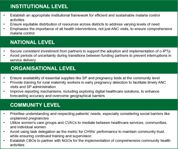 Results: Health providers perceived c-IPTp positively, reducing their workload, allowing midwives to focus on other consultations, and addressing access issues in remote villages. However, some healthcare providers perceived that c-IPTp undermined attendance at antenatal care visits. Stockouts of SP and the unavailability of pregnancy tests were key barriers to uptake. Appropriate incentivization of community health workers was also a key factor for service delivery. Pregnant women found c-IPTp acceptable, appreciating the risks of malaria in pregnancy and perceiving SP to be effective. However, they expressed concerns regarding adverse events and socio-cultural issues around unplanned pregnancies. Key recommendations to strengthen c-IPTp delivery include ensuring supplies of SP and pregnancy tests, improving reporting mechanisms, incentivising community health workers, gaining acceptance from pregnant women, and securing consistent funding. It is also key that patient's individual needs are prioritized and that communities are fully involved in decision-making.