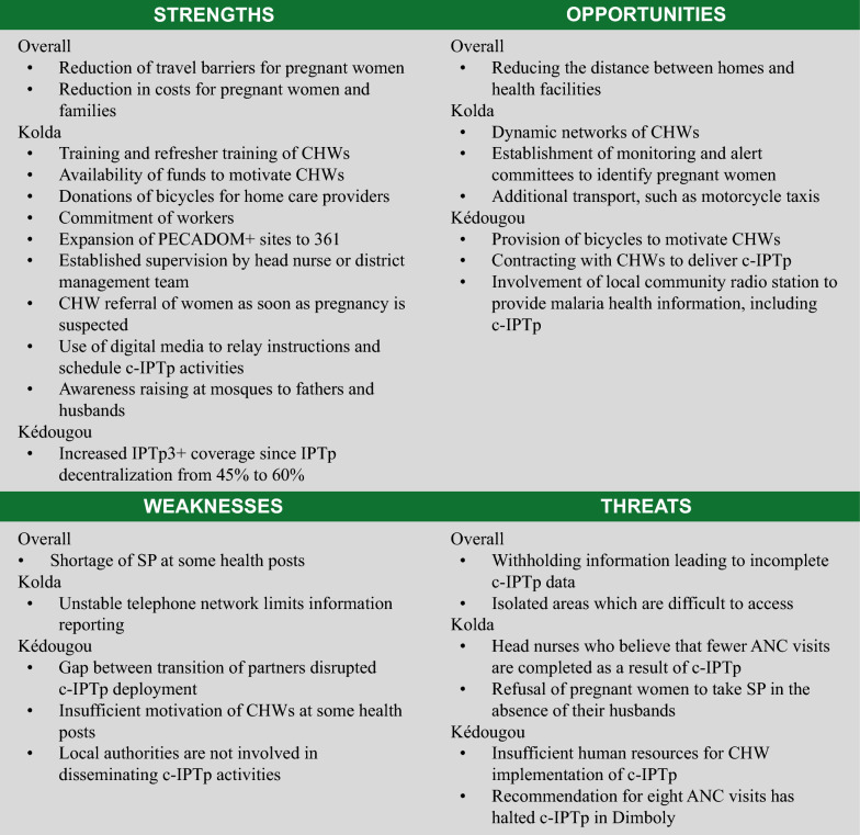 Methods: The study employed 111 semi-structured interviews and 16 focus group discussions to explore stakeholders' perspectives on c-IPTp in Senegal. Purposive sampling was used to select high malaria-endemic districts in Kolda and Kedougou. Inclusion criteria were experience of c-IPTp as a patient, caregiver, beneficiary, decision maker, or communicator/advocate (e.g., community leader). Individuals without experience in c-IPTp were excluded. Following thematic analysis, findings were synthesized into strengths, weaknesses, opportunities, and threats to inform the production of recommendations to promote and expand c-IPTp uptake in Senegal.