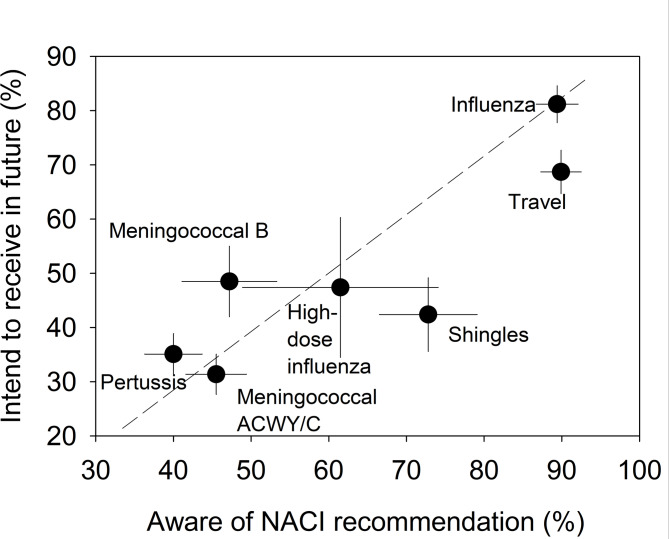 Results: As compared to non-intervention communities, respondents in intervention communities had improved awareness of their vaccination status and increased self-reported uptake for meningococcal ACWY/C and travel vaccines, and reduced uptake of the shingles vaccine (P < 0.05). From combined analysis of non-intervention and intervention communities, willingness to receive a vaccine was strongly associated with being offered that vaccine in the past (R = 1.0, P < 10⁻⁷) and with awareness of recommendations from the National Advisory Committee on Immunization (NACI) (R = 0.79, P < 10⁻⁷). Less than 13% of respondents were aware that pharmacists provide the pertussis vaccine, while 90.7% reported they would receive all studied vaccines if free of charge. Respondents without access to a family physician had three-times higher odds of using the internet for vaccine information compared to those with a physician.