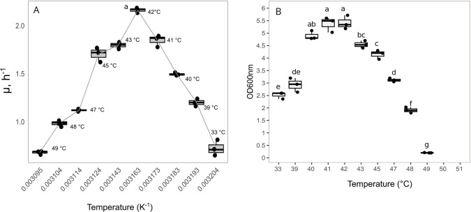 Bovicin HC5, a bacteriocin produced by Streptococcus equinus HC5, demonstrates inhibitory activity against pathogenic and spoilage microorganisms. However, low production yields hinder its widespread application. This study investigated the impact of temperature on S. equinus HC5 growth and employed adaptive laboratory evolution (ALE) under heat stress to obtain variants with improved bovicin HC5 production. The optimal growth temperature for the wild-type strain was determined to be 42 °C, with growth ceasing above 49 °C. Following 400 generations of ALE at 47 °C and 48 °C, eight variants were selected. Two of these variants exhibited significantly enhanced bovicin HC5 production, reaching up to a 140% increase (P < 0.05). The variant with the highest bacteriocin yield showed increased expression of bvcA, the gene encoding the bovicin HC5 precursor peptide. This high-producing variant also displayed enhanced thermal resistance, a higher growth rate (μ = 1.33 ± 0.02 h-1), and increased biomass accumulation (OD600nm = 4.03 ± 0.06) at 48 °C compared to the wild-type strain (μ = 0.98 ± 0.04 h-1; OD600nm = 1.96 ± 0.12) (P < 0.05). Furthermore, the selected variants exhibited alterations in membrane composition, characterized by an increased concentration of saturated fatty acids and a reduced Zeta potential (P < 0.05). Genomic analysis of these variants identified mutations in genes involved in protein modification, transcriptional regulation, and cellular transport, including a lantibiotic permease. These results demonstrate the effectiveness of ALE for generating S. equinus HC5 variants with improved bovicin HC5 production and provide valuable insights for optimizing bacteriocin biosynthesis strategies. KEY POINTS: • The optimal growth temperature for the Streptococcus equinus HC5 strain was determined to be 42 °C, with growth ceasing above 49 °C • The variant Streptococcus equinus HC5 40048 with the highest bacteriocin yield showed increased expression of bvcA, the gene encoding the bovicin HC5 precursor peptide • ALE is an efficient metabolic engineering strategy to increase bacteriocin production in Streptococcus equinus HC5.