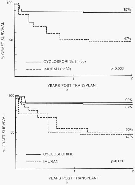 Ninety-seven cadaveric renal transplants were performed upon 96 patients during 1981. The one year patient mortality was 2.1 per cent. Seventy of the recipients were undergoing transplantation for the first time. Of these patients, 38 were treated with cyclosporine and steroids with a one year graft survival rate of 89.5 per cent. The other 32 primary recipients were treated with azathioprine and steroids with a one year graft survival rate of 50 per cent. The difference between the cyclosporine-steroid versus conventional therapy groups was significant. Cyclosporine and steroids also were used to treat 26 patients who underwent retransplantation with 27 cadaveric grafts. The one year graft survival time was 77.8 per cent; most of the graft losses were in presensitized patients. The results with retransplantation were twice as good as in historical control groups.