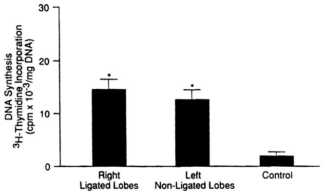 The proliferative response of the rat liver was measured after temporary or permanent total biliary obstruction (BDO) and in different regions after selective ligation of the lobar ducts draining the right 60% of the hepatic mass. The results were compared with those after 70% partial hepatectomy (PH). Cell proliferation was assessed globally by measuring DNA synthesis and stratified to the separate cell populations with cytostaining techniques that allowed distinction of hepatocytes, duct cells, and nonparenchymal cells (NPCs). In selected experimental groups, gene expression was determined of transforming growth factor-beta 1 (TGF beta-1), prothrombin, c-erb-B2, transforming growth factor alpha (TGF alpha), human Cyclophilin (CyP), and 28S ribosomal RNA. The stimulation of a proliferative response to total BDO required obstruction for longer than 24 hours, but after this deligation did not switch off regeneration. In the first week after permanent BDO, there was progressive infiltration of NPCs, fibrous linkage of some portal areas, and a crescendo of DNA synthesis that was obvious at 24 hours, maximal at 48 hours, and back nearly to baseline at 6 days. At the 2-day mark, the bile duct cells had a 17-fold increase in proliferation, accompanied by a threefold to fourfold increase in hepatocyte renewal. Little or no increase in expression of TGF alpha or the hepatocyte-specific prothrombin gene was detectable in the first 48 hours, whereas levels of the oncogene c-erb-B2 that is associated with cholangiocarcinoma were expressed from 48 to 96 hours.(ABSTRACT TRUNCATED AT 250 WORDS)