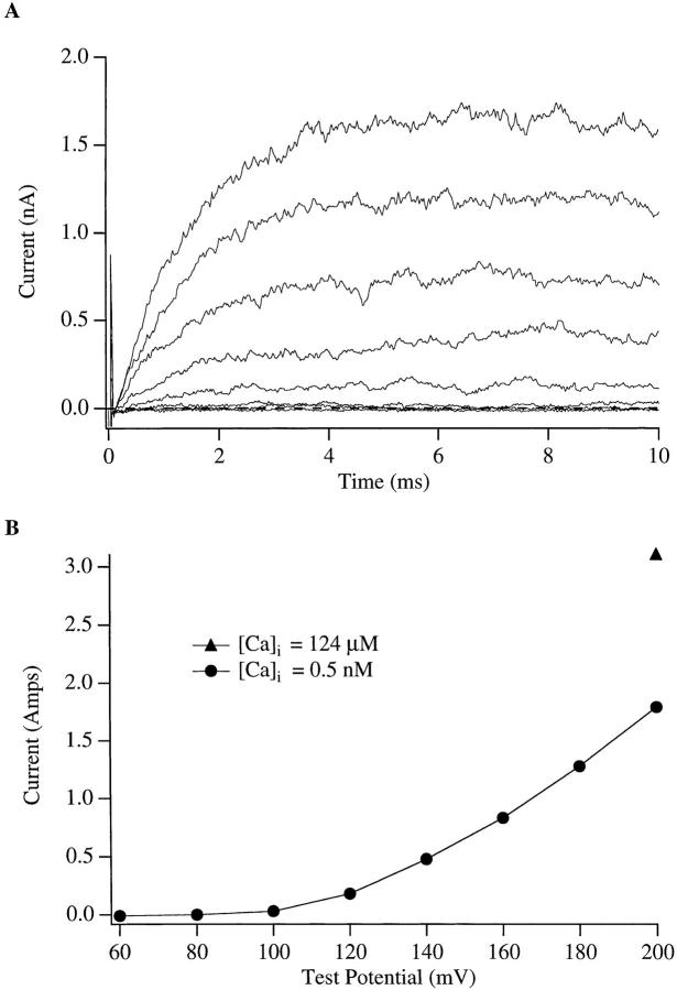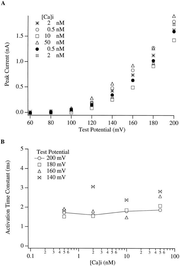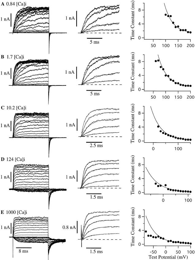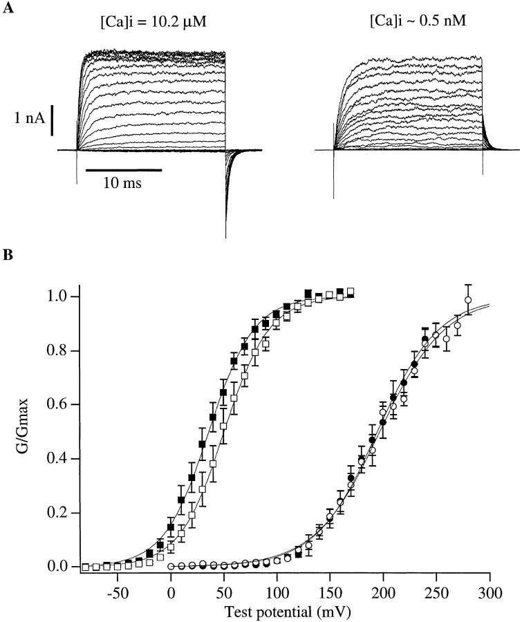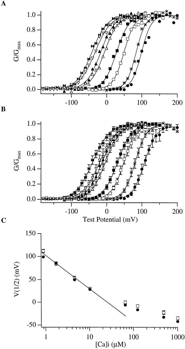 The kinetic and steady-state properties of macroscopic mslo Ca-activated K+ currents were studied in excised patches from Xenopus oocytes. In response to voltage steps, the timecourse of both activation and deactivation, but for a brief delay in activation, could be approximated by a single exponential function over a wide range of voltages and internal Ca2+ concentrations ([Ca]i). Activation rates increased with voltage and with [Ca]i, and approached saturation at high [Ca]i. Deactivation rates generally decreased with [Ca]i and voltage, and approached saturation at high [Ca]i. Plots of the macroscopic conductance as a function of voltage (G-V) and the time constant of activation and deactivation shifted leftward along the voltage axis with increasing [Ca]i. G-V relations could be approximated by a Boltzmann function with an equivalent gating charge which ranged between 1.1 and 1.8 e as [Ca]i varied between 0.84 and 1,000 microM. Hill analysis indicates that at least three Ca2+ binding sites can contribute to channel activation. Three lines of evidence indicate that there is at least one voltage-dependent unimolecular conformational change associated with mslo gating that is separate from Ca2+ binding. (a) The position of the mslo G-V relation does not vary logarithmically with [Ca]i. (b) The macroscopic rate constant of activation approaches saturation at high [Ca]i but remains voltage dependent. (c) With strong depolarizations mslo currents can be nearly maximally activated without binding Ca2+. These results can be understood in terms of a channel which must undergo a central voltage-dependent rate limiting conformational change in order to move from closed to open, with rapid Ca2+ binding to both open and closed states modulating this central step.