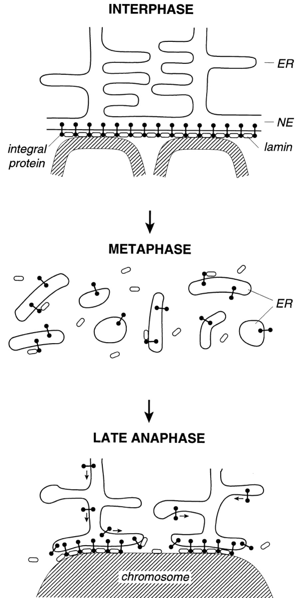 We have analyzed the fate of several integral membrane proteins of the nuclear envelope during mitosis in cultured mammalian cells to determine whether nuclear membrane proteins are present in a vesicle population distinct from bulk ER membranes after mitotic nuclear envelope disassembly or are dispersed throughout the ER. Using immunofluorescence staining and confocal microscopy, we compared the localization of two inner nuclear membrane proteins (laminaassociated polypeptides 1 and 2 [LAP1 and LAP2]) and a nuclear pore membrane protein (gp210) to the distribution of bulk ER membranes, which was determined with lipid dyes (DiOC6 and R6) and polyclonal antibodies. We found that at the resolution of this technique, the three nuclear envelope markers become completely dispersed throughout ER membranes during mitosis. In agreement with these results, we detected LAP1 in most membranes containing ER markers by immunogold electron microscopy of metaphase cells. Together, these findings indicate that nuclear membranes lose their identity as a subcompartment of the ER during mitosis. We found that nuclear lamins begin to reassemble around chromosomes at the end of mitosis at the same time as LAP1 and LAP2 and propose that reassembly of the nuclear envelope at the end of mitosis involves sorting of integral membrane proteins to chromosome surfaces by binding interactions with lamins and chromatin.