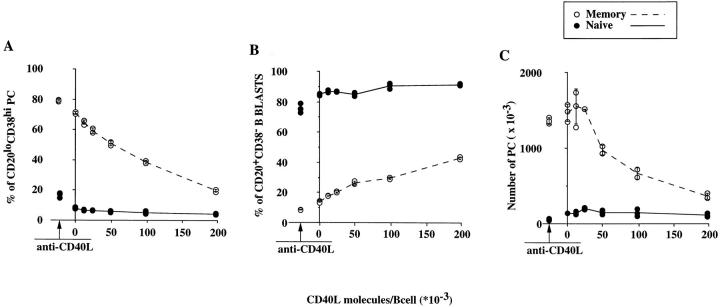 Isolation of large numbers of surface IgD+CD38- naive and surface IgD-CD38- memory B cells allowed us to study the intrinsic differences between these two populations. Upon in vitro culture with IL-2 and IL-10, human CD40-activated memory B cells undergo terminal differentiation into plasma cells more readily than do naive B cells, as they give rise to five- to eightfold more plasma cells and three- to fourfold more secreted immunoglobulins. By contrast, naive B cells give rise to a larger number of nondifferentiated B blasts. Saturating concentrations of CD40 ligand, which fully inhibit naive B cell differentiation, only partially affect that of memory B cells. The propensity of memory B cells to undergo terminal plasma cell differentiation may explain the extensive extra follicular plasma cell reaction and the limited germinal center reaction observed in vivo after secondary immunizations, which contrast with primary responses in carrier-primed animals. This unique feature of memory B cells may confer two important capacities to the immune system: (a) the rapid generation of a large number of effector cells to efficiently eliminate the pathogens; and (b) the prevention of the overexpansion and chronic accumulation of one particular memory B cell clone that would freeze the available peripheral repertoire.