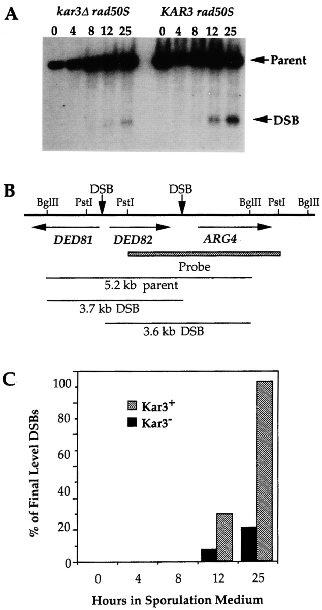 The recognition and alignment of homologous chromosomes early in meiosis is essential for their subsequent segregation at anaphase I; however, the mechanism by which this occurs is unknown. We demonstrate here that, in the absence of the molecular motor, Kar3p, meiotic cells are blocked with prophase monopolar microtubule arrays and incomplete synaptonemal complex (SC) formation. kar3 mutants exhibit very low levels of heteroallelic recombination. kar3 mutants do produce double-strand breaks that act as initiation sites for meiotic recombination in yeast, but at levels severalfold reduced from wild-type. These data are consistent with a meiotic role for Kar3p in the events that culminate in synapsis of homologues.