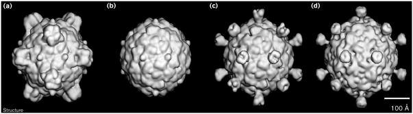 Results: The three-dimensional structure of SpV4 was determined to 27 A resolution from images of frozen-hydrated particles. Cryo-electron microscopy (cryo-EM) revealed 20, approximately 54 A long, 'mushroom-like' protrusions on the surface of the capsid. Each protrusion comprises a trimeric structure that extends radially along the threefold icosahedral axes of the capsid. A 71 amino acid portion of VP1 (the SpV4 capsid protein) was shown, by structural alignment with the atomic structure of the F capsid protein of phi X174, to represent an insertion sequence between the E and F strands of the eight-stranded antiparallel beta-barrel. Secondary structure prediction of this insertion sequence provided the basis for a probable structural motif, consisting of a six-stranded antiparallel beta sheet connected by small turns. Three such motifs form the rigid stable trimeric structures (mushroom-like protrusions) at the threefold axes, with hydrophobic depressions at their distal surface.