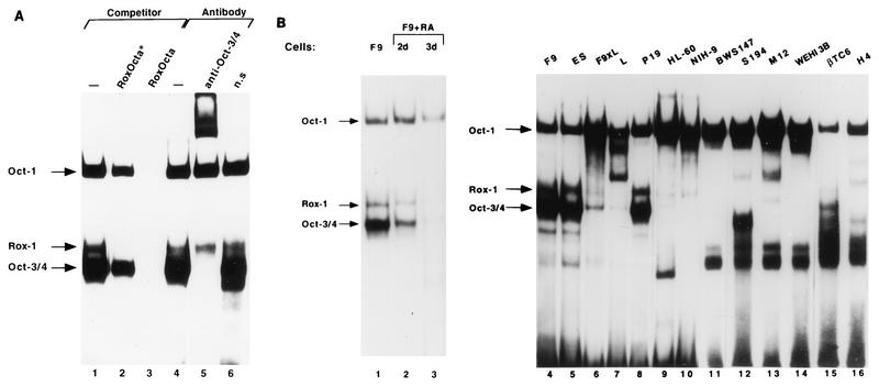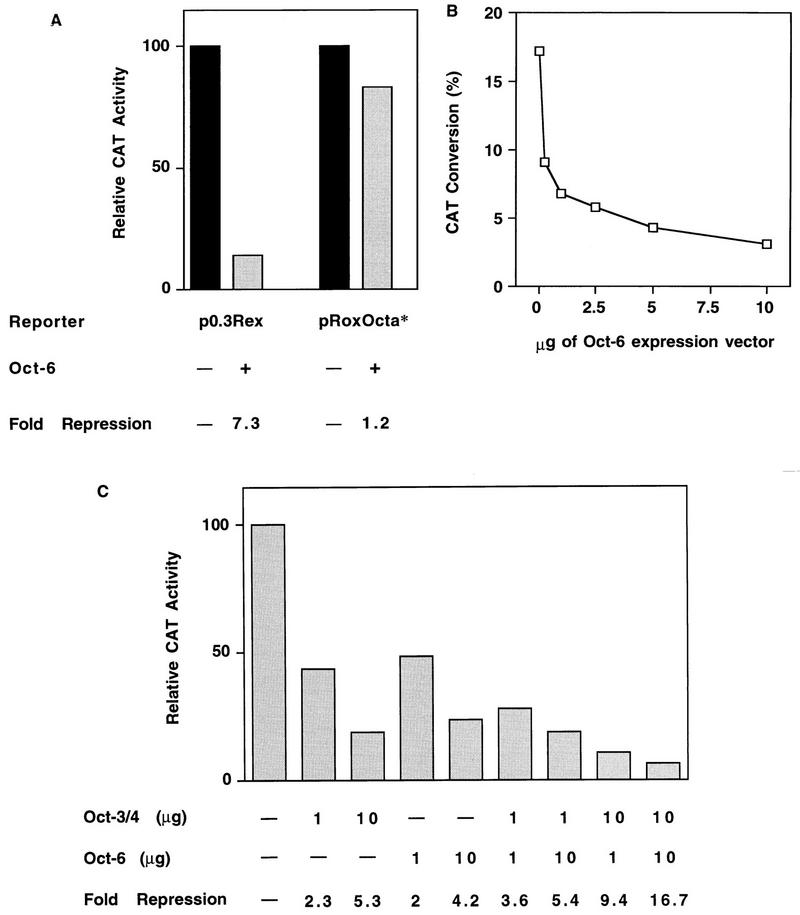 The Rex-1 (Zfp-42) gene, which encodes an acidic zinc finger protein, is expressed at high levels in embryonic stem (ES) and F9 teratocarcinoma cells. Prior analysis identified an octamer motif in the Rex-1 promoter which is required for promoter activity in undifferentiated F9 cells and is involved in retinoic acid (RA)-associated reduction in expression. We show here that the Oct-3/4 transcription factor, but not Oct-1, can either activate or repress the Rex-1 promoter, depending on the cellular environment. Rex-1 repression is enhanced by E1A. The protein domain required for Oct-3/4 activation was mapped to amino acids 1 to 35, whereas the domain required for Oct-3/4 repression was mapped to amino acids 61 to 126, suggesting that the molecular mechanisms underlying transcriptional activation and repression differ. Like Oct-3/4, Oct-6 can also lower the expression of the Rex-1 promoter via the octamer site, and the amino-terminal portion of Oct-6 mediates this repression. In addition to the octamer motif, a novel positive regulatory element, located immediately 5' of the octamer motif, was identified in the Rex-1 promoter. Mutations in this element greatly reduce Rex-1 promoter activity in F9 cells. High levels of a binding protein(s), designated Rox-1, recognize this novel DNA element in F9 cells, and this binding activity is reduced following RA treatment. Taken together, these results indicate that the Rex-1 promoter is regulated by specific octamer family members in early embryonic cells and that a novel element also contributes to Rex-1 expression.