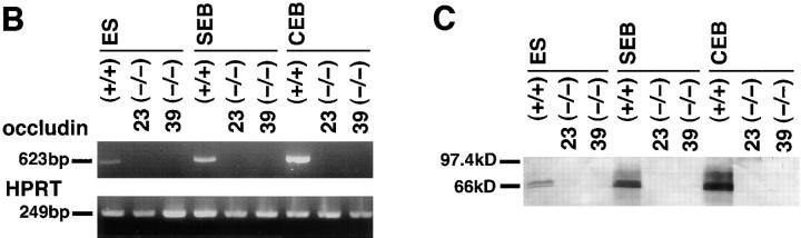 Occludin is the only known integral membrane protein of tight junctions (TJs), and is now believed to be directly involved in the barrier and fence functions of TJs. Occludin-deficient embryonic stem (ES) cells were generated by targeted disruption of both alleles of the occludin gene. When these cells were subjected to suspension culture, they aggregated to form simple, and then cystic embryoid bodies (EBs) with the same time course as EB formation from wild-type ES cells. Immunofluorescence microscopy and ultrathin section electron microscopy revealed that polarized epithelial (visceral endoderm-like) cells were differentiated to delineate EBs not only from wild-type but also from occludin-deficient ES cells. Freeze fracture analyses indicated no significant differences in number or morphology of TJ strands between wild-type and occludin-deficient epithelial cells. Furthermore, zonula occludens (ZO)-1, a TJ-associated peripheral membrane protein, was still exclusively concentrated at TJ in occludin-deficient epithelial cells. In good agreement with these morphological observations, TJ in occludin-deficient epithelial cells functioned as a primary barrier to the diffusion of a low molecular mass tracer through the paracellular pathway. These findings indicate that there are as yet unidentified TJ integral membrane protein(s) which can form strand structures, recruit ZO-1, and function as a barrier without occludin.